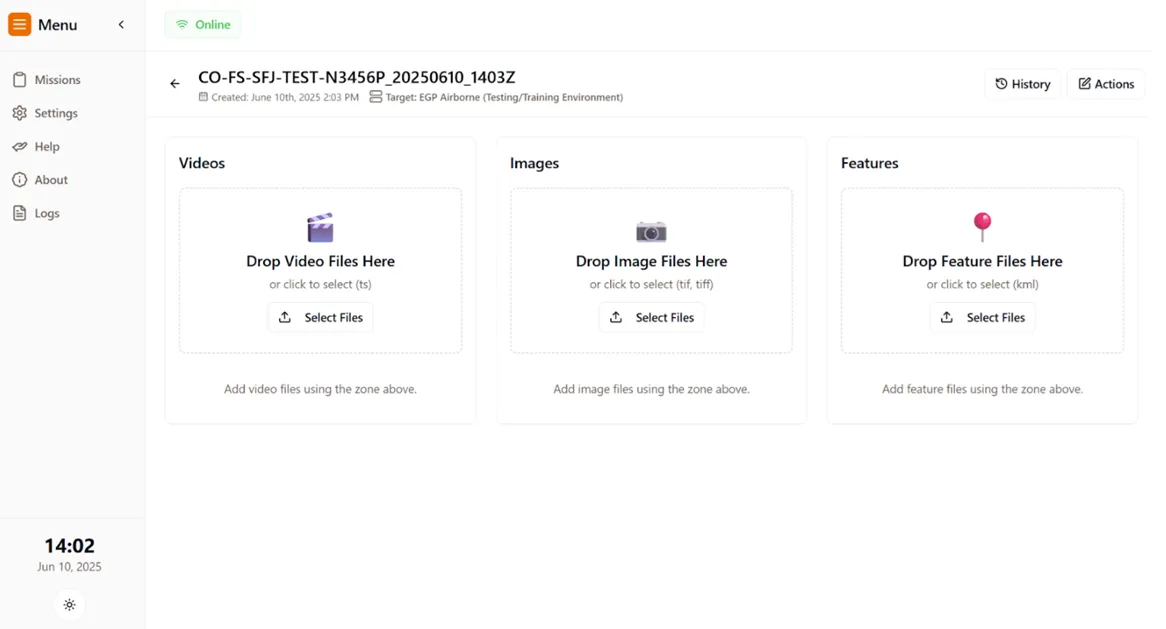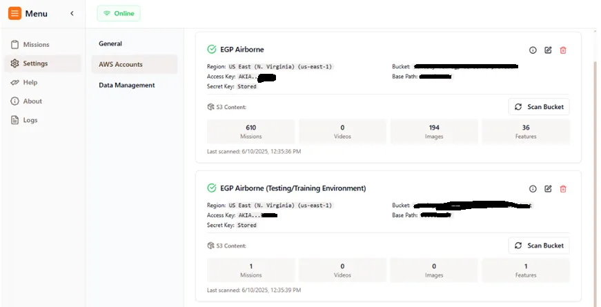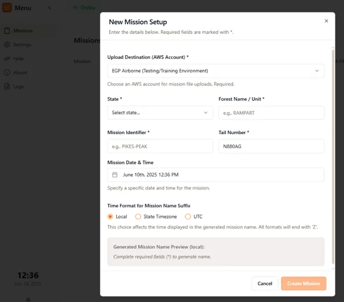 To begin you can create a test mission and use the “EGP Airborne (Testing/Training Environment)” account and upload whatever you want to get familiar with the process. This data is sent to a S3 bucket that is not monitored and will not be included in any Web Applications ie. WildFireSA Advanced or Intterra SA. This environment is only to test out how the software works or any assistance in debugging.