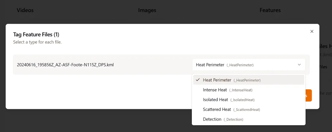 If you add files to the Images or Features, it will pop up a prompt to select the type of KML or Tiff files. Ie. EO IR, Heat Perimeter, etc.. Select the correct type and select “Confirm Tags and Add Files”