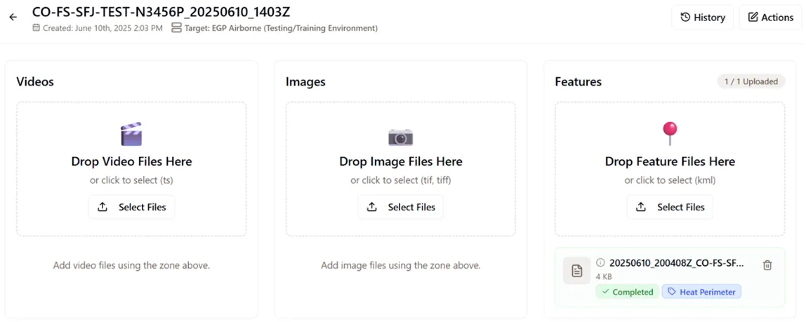 Click the “Select Files” on either the Video, Images or Features to add the appropriate data to the mission. If you are online, it will immediately upload the files. It will also create a new filename that matches the files that were added. You do not need to edit the source filenames for any reason. You will see in tooltips the source and destination filenames.