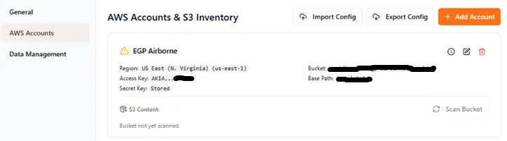 4.3. You can validate the credentials are working by clicking the “Scan Bucket” and you should see some number for the various S3 buckets.